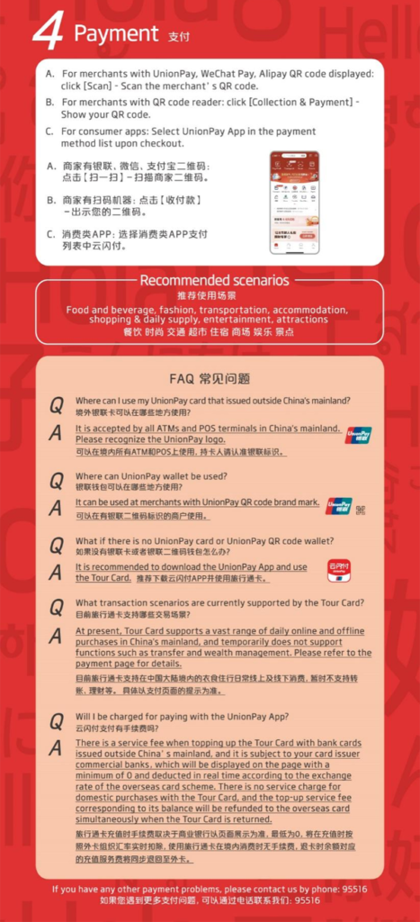 In Shanghai, you can enjoy convenient mobile payment with Alipay, Weixin Pay, UnionPay or your overseas e-wallets. Please call English Service Hotlines if you have any questions or need further information.